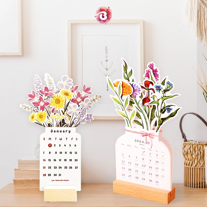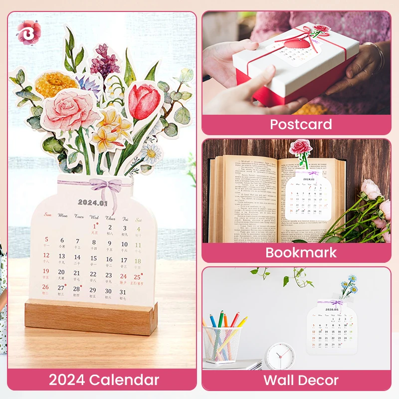 Package Includes: 1 x 2024 Bloomy Flower Calendar + Wooden Stand